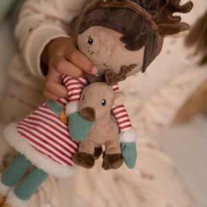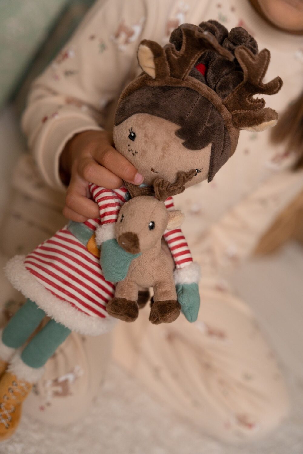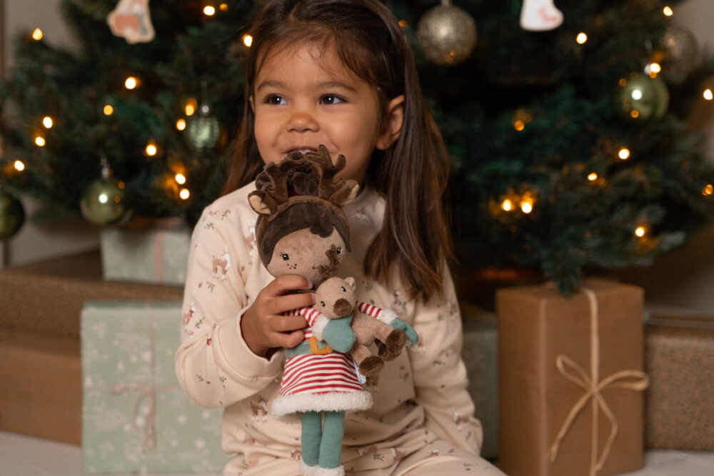 Η Evi κρατάει αγκαλιά το αγαπημένο της ταρανδάκι και φοράει μια παιχνιδιάρικη στέκα στα μαλλιά.